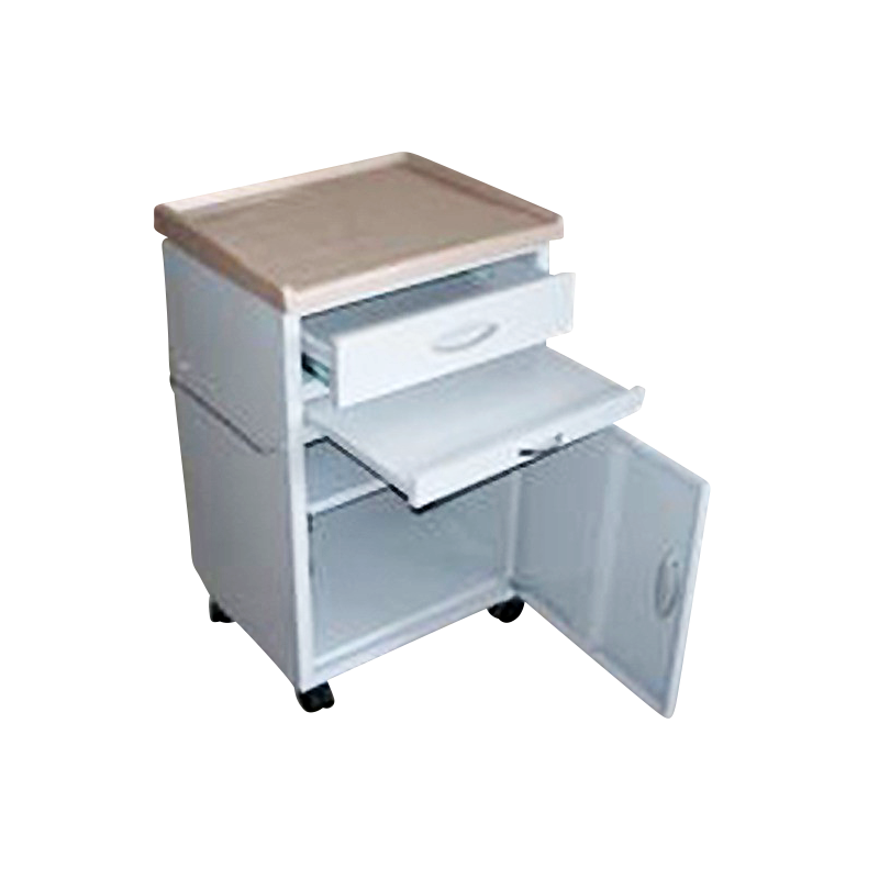 KNOCK DOWN BEDSIDE TABLE • Steel powder coating construction • 1 drawer • Phenolic compact board surface • Stainless steel fence • With one steel plate • 1 lock