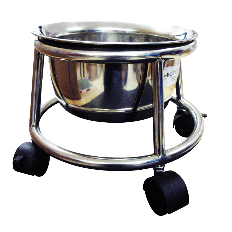 WASTE KICK BUCKET • Mobile waste bassin • Made of stainless steel • Support mounted on 30mm castors • Capacity 16L. • Dimensions.: Ø 41 x 18 H cm