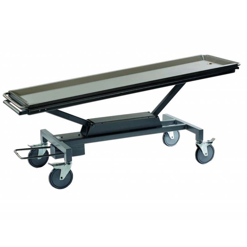Electric stretchers lift truck for insertion and extraction from the cold room. • Entirely made of painted steel • Double-scissors lifting frame • Oil-pressure lifting system by a hydraulic pump • Lowering by adjustable speed. •...