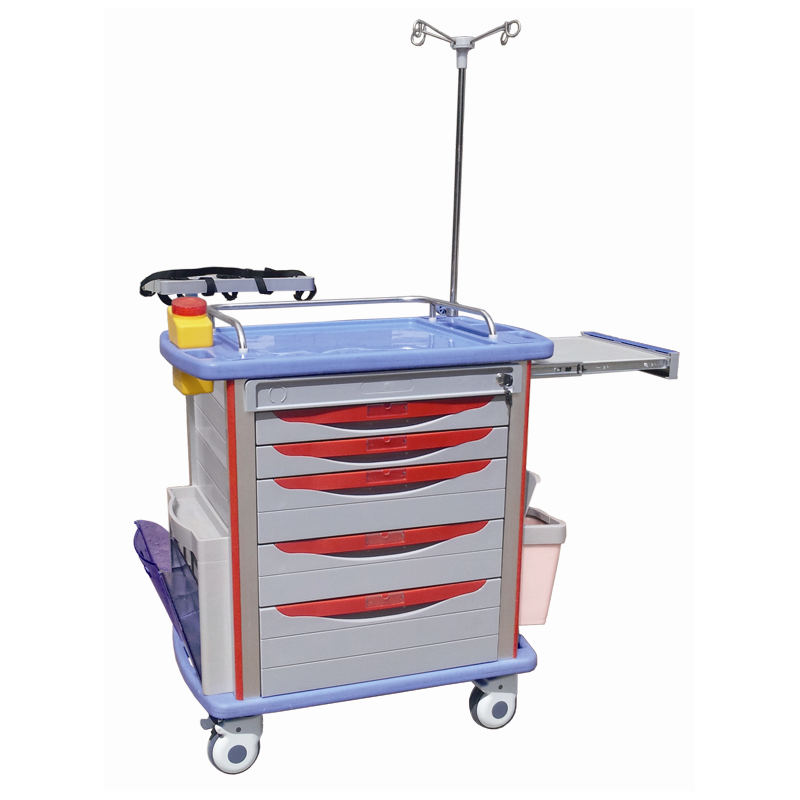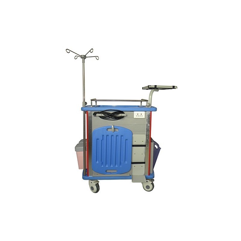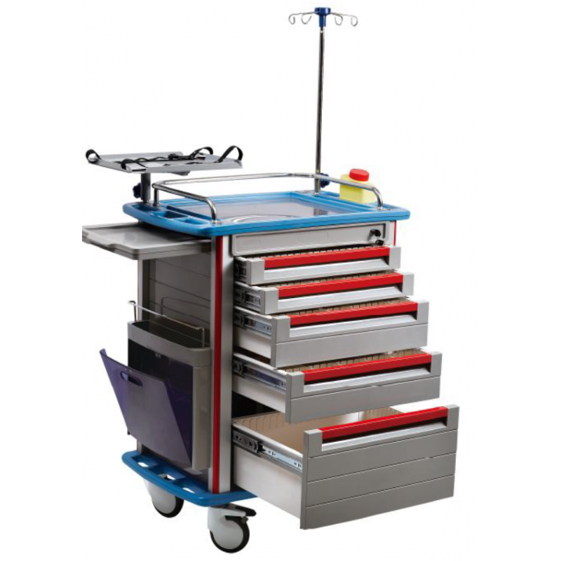 EMERGENCY TROLLEY • Dimensions: 56 x 64 x 104h cm • Structure, drawer faces and supporting base in melamine • Working surface made of washable, shockproof polystyrene • 4 drawers: 3 x h14.5cm & 1 x 31.5cm • Drawers made of plastic on...