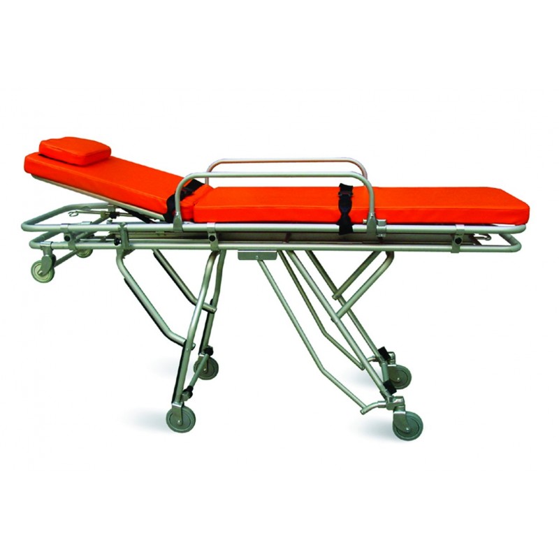 EMERGENCY STRETCHER • Enameled steel structure. • Mesh platform made of steel rod divided into two removable sections,to optimize sanitation. • Clutch to insert the IV pole near the corners. • Push handles and side rails made of enameled...