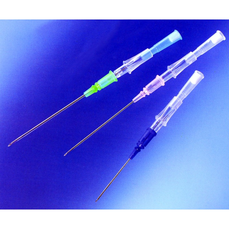 Intravenous catheters with integrated injection port and valve for peripheral catheterisation.