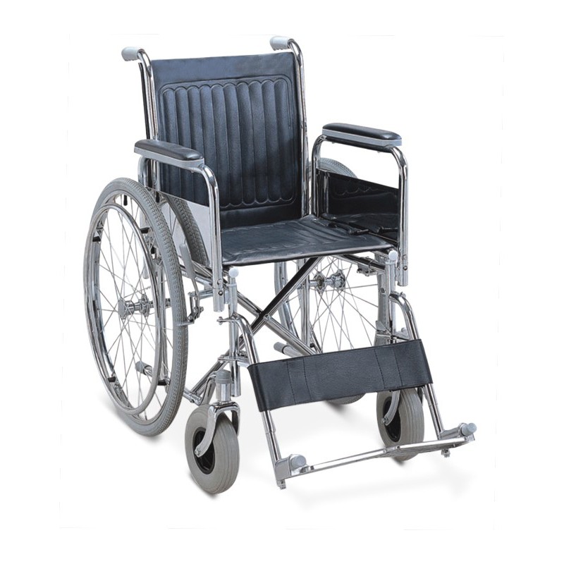 WHEEL CHAIR • Economic model • Constructed from tubular steel epoxy coated • Arm rest removable • Foot rests adjustable in height and laterally foldable. • On 4 swiveling castors, 2 with brake