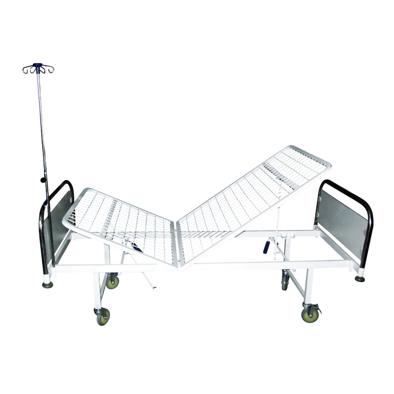 HOSPITAL BED • Made from epoxy coated steel square tubes. • Metal mesh mattress platform. • Bed Head/Foot from ABS • Back section adjustable by mean of handcrank. • With castors 50mm diam. 2 with brake. • Dimensions: 190 x 80 x 50cm