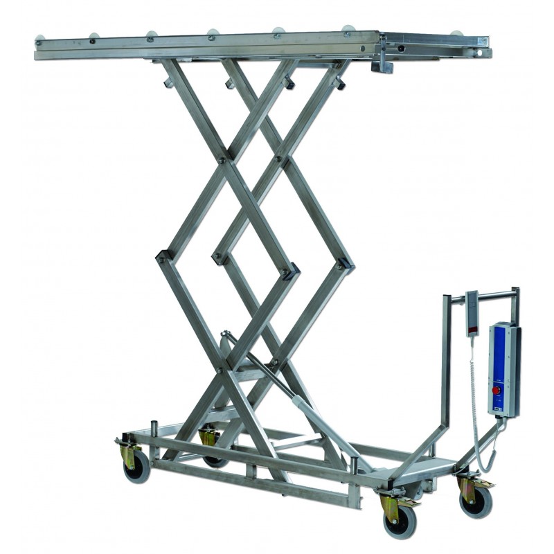 Electric stretchers lift truck for insertion and extraction from the cold room. • Entirely made of painted steel • Double-scissors lifting frame • Oil-pressure lifting system by a hydraulic pump • Lowering by adjustable speed. •...