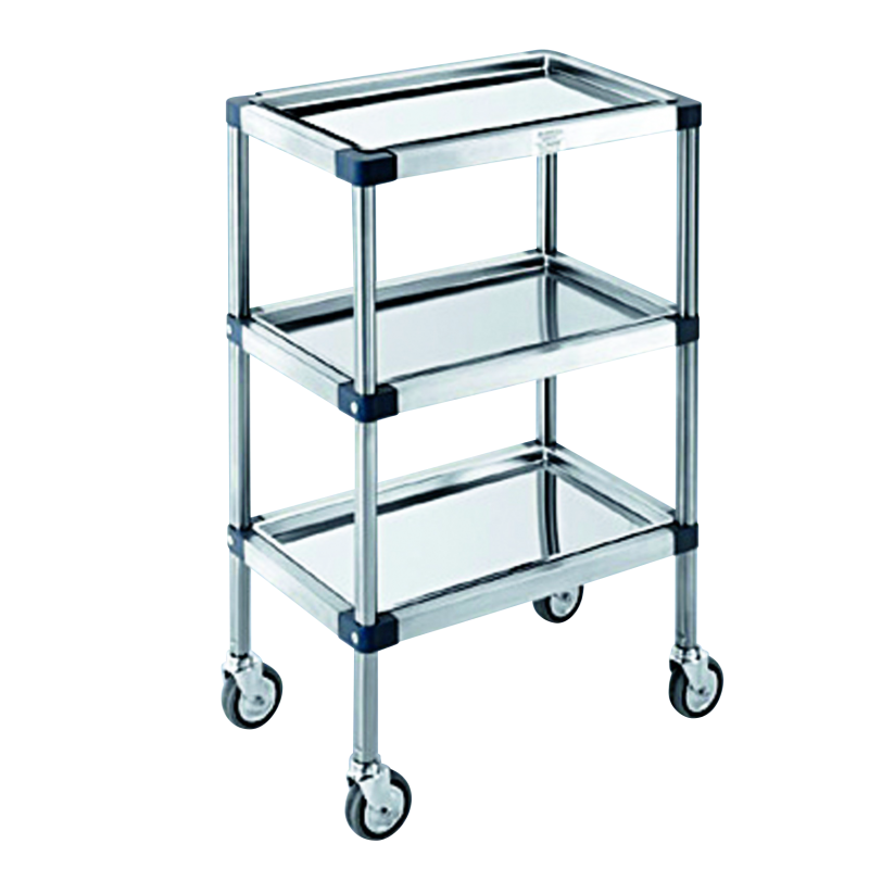 DRESSING TROLLEY • With 3 removable trays • Constructed from stainless steel • Mounted on castors 80 mm • 3 removable trays from laminated plastic • 49 x 30 x 78 h cm
