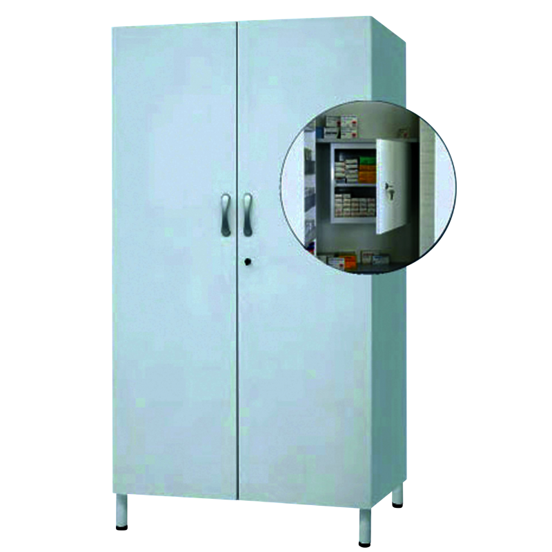 MEDICINES CUPBOARD• Construction from enamelled sheet steel • Upper tempered glass door • Lockable with key • Lower doors from steel sheet • Lockable by key • 1 Spare key • Dimensions: 80 x 37 x 193 cm