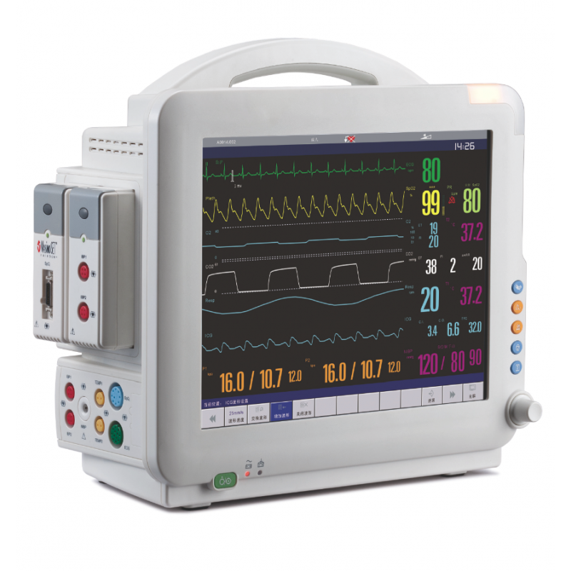 This monitor was designed to meet the requirements of various hospital environments. The parameters of the main unit fit every standard monitoring demand. The optional modules upgrade the monitor to suit acute care monitoring.