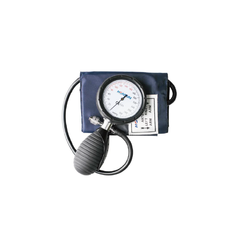 SELF TEST SPHYGMOMANOMETER • Special Aluminium alloy manometer • Single head stethoscope attached to the Cuff • Nylon Cuff with D-ring • Standard PVC bulb • 2 tubes adult size pvc bladder • Graduation 0-300mm/Hg • Tolerance +-...